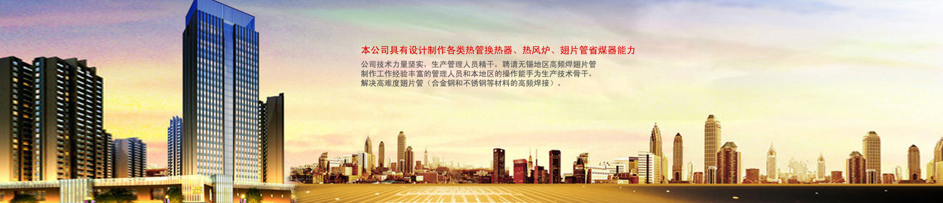 無(wú)錫市新寶紅換熱器有限公司 ???????無(wú)錫市新寶紅換熱器有限公司位于美麗的太湖之濱,是一家專業(yè)生產(chǎn)翅片管,翅片管換熱器,高頻焊螺旋翅片管,熱管式換熱器的廠家。
